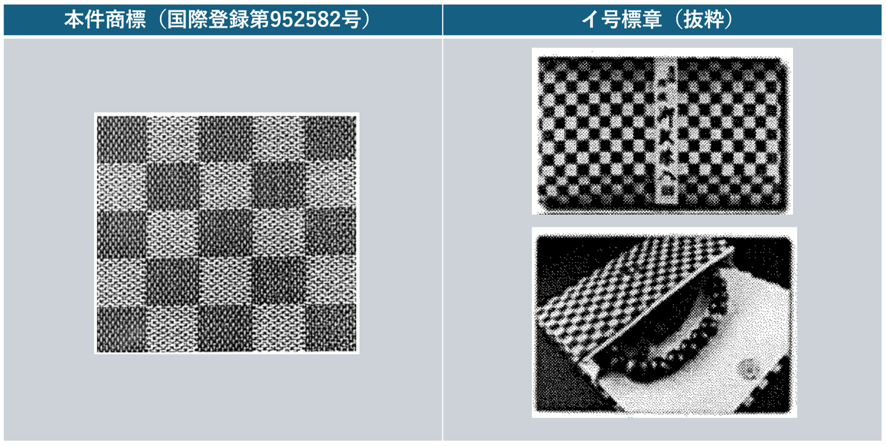 イ号標章は、日本古来の模様として広く一般に知られている「市松模様」(色の違う二種類の正方形または長方形を、互い違いに並べた模様)と同様の態様である、と認定されました。